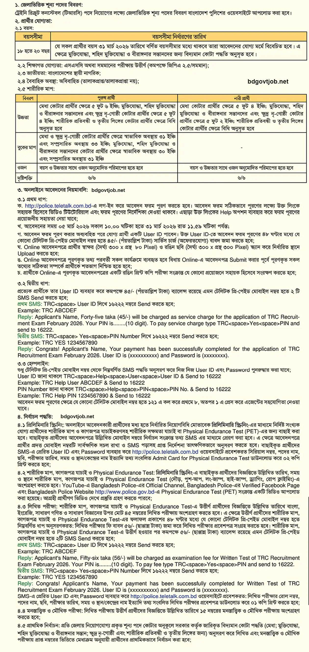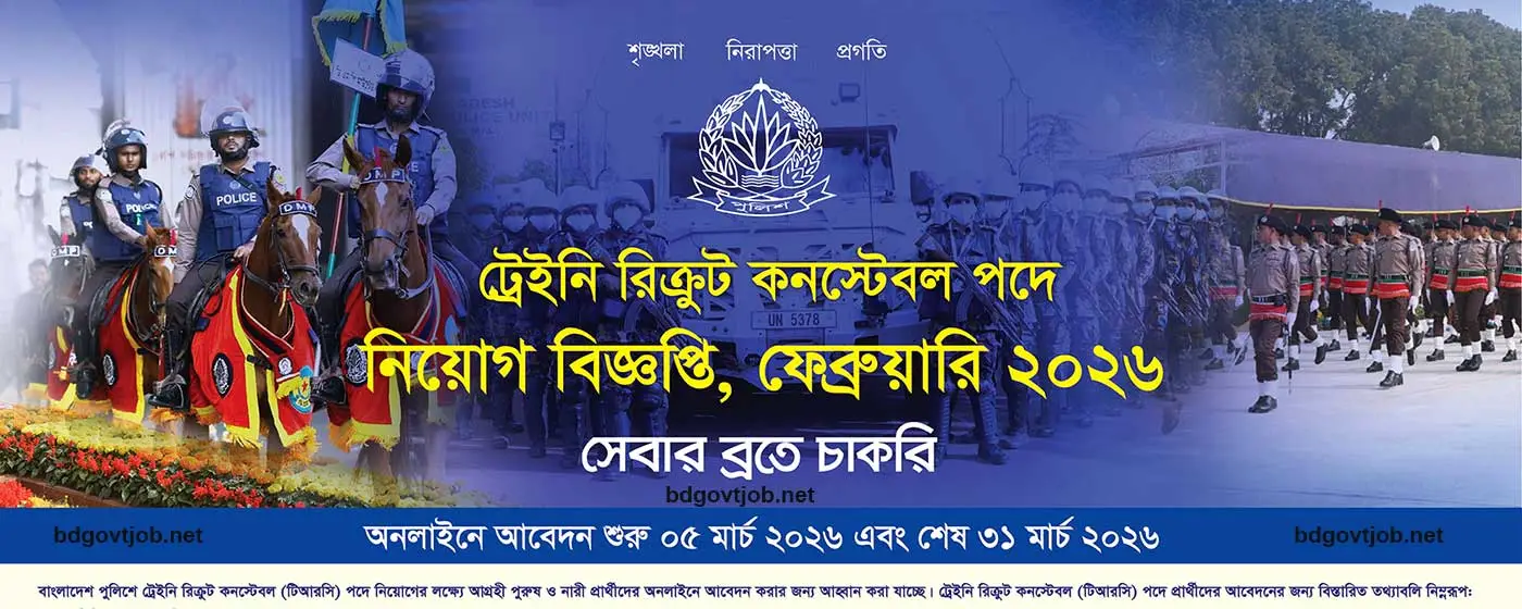 সম্প্রতি Bangladesh Police তাদের বাহিনীকে শক্তিশালী করার লক্ষ্যে Trainee Recruit Constable (TRC) পদে নতুন জনবল নিয়োগের জন্য একটি নিয়োগ বিজ্ঞপ্তি প্রকাশ করেছে। সারা বাংলাদেশের যোগ্য ও আগ্রহী প্রার্থীরা এই পদে আবেদন করতে পারবেন।